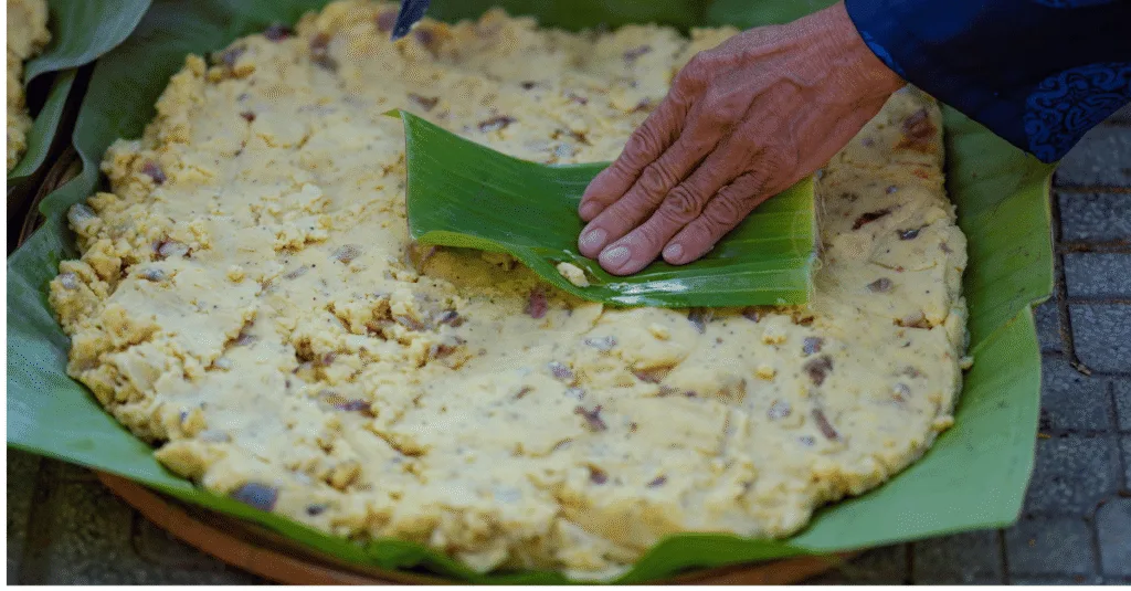 Phân bổ nguyên liệu là bước quan trọng để bánh chưng có nhân đều và hương vị hài hòa.